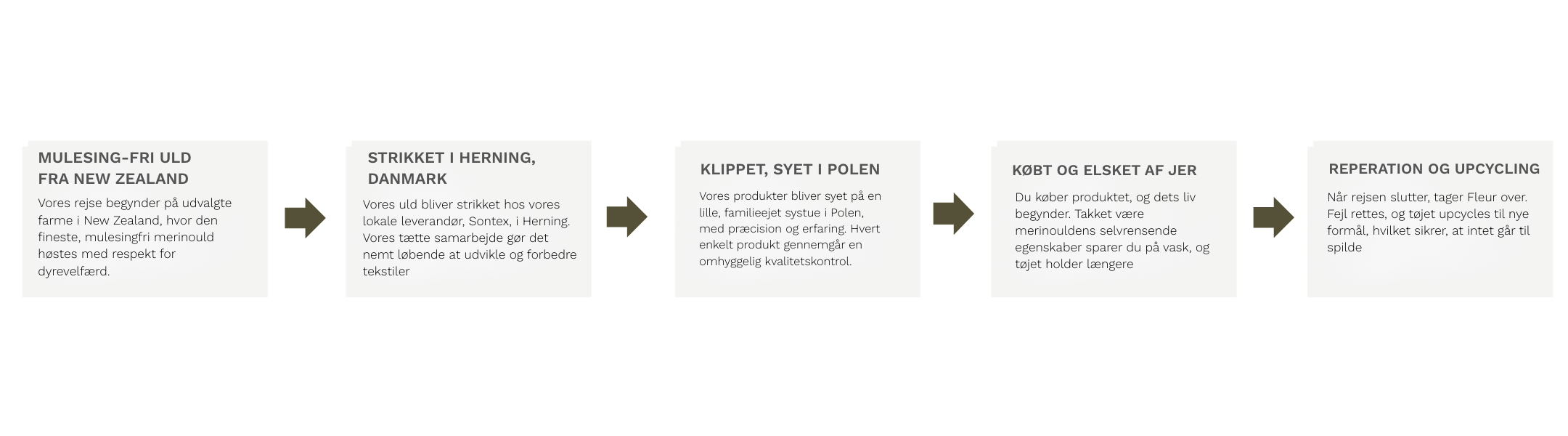 Vores merinould kommer fra New Zealand – det eneste sted, der lever op til vores strenge standarder. Dyrevelfærd er vores prioritet: vi accepterer kun 100% mulesing-fri uld fra farme, der overholder 'The Five Freedoms of Sheep' og garanterer en mulesing-fri praksis.